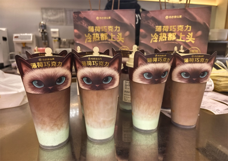 在“颜值即正义”的新消费时代,书亦将“萌宠美学”作为巧克力新品的营销卖点。全国门店里原创猫咪形象的萌系包材和CG视频专属互动,巧妙击中铲屎官的身份认同,让消费者情感共鸣从产品延伸至品牌认同。另,利用猫咪对薄荷的喜爱和沉迷属性,场景化植入饮品的具象化卖点,无疑更具感染力和说服力,也更能打动消费者。大批网友在社交平台上晒图种草,“云吸猫,今天被书亦的暹罗猫杯套治愈了。”,“今天变身薄荷味的猫猫!”。