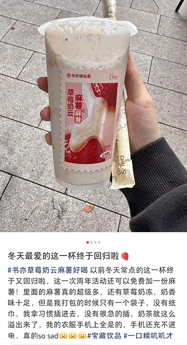 消费者对老品回归的期待,本质上是对产品品质的体验特性以及在产品之外丰富的品牌情感联结。社交平台上“草莓麻薯回归”的帖子超过2万条,许多消费者分享了自己与这款产品的故事:有人因它爱上麻薯的口感,有人喜欢它粉粉的颜值满满少女心,甚至有人将其视为“秋冬的身心温暖疗愈”。